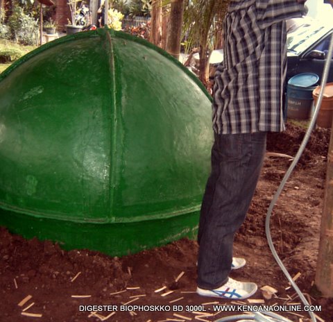 Biogas sebagai hasil dari suatu proses fermentasi aneka material organik ( semua bahan berasal dari makhluk hidup) adalah sumber energi baru terbarukan (renuwable energy) yang dapat diperoleh dengan biaya murah, dari bahan yang selama ini dikatagorikan sebagai sampah. Gas yang terbentuk dalam tabung kedap (tanpa oksigen) Digester Biogas BD 5000L, dibuat dari fiber glass berbahan resin eternal 2504, jenis mat Wr 200 ( mat anyam) dan mat 300 ( acak), ketebalan 3 – 5 mm, mampu memfermentasi 5 m3 kemudian ditambahkan ke melalui pengumpan sejumlah 0,5 m3 per hari. Sampah dan berbagai bahan organik dapat terus menerus setiap hari ditambahkan ke lobang pemasukan (intake chamber) dan akan diurai oleh bakteri anaerobic Green Phoskko (GP-7), untuk pertama kalinya hanya 5 sampai 7 hari telah mulai mengeluarkan gas methana (CH4) dan tersimpan di bagian atas tabung ( gas holder). Selanjutnya, biomassa (biomass) organik dapat terus menerus ditambahkan setiap hari, sepanjang tekanan dalam gas holder berkurang karena penggunaan bagi bahan bakar panas ( kompor, tungku) maupun bahan bakar gas oleh genset modifikasi Bio elektrik.