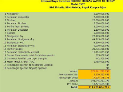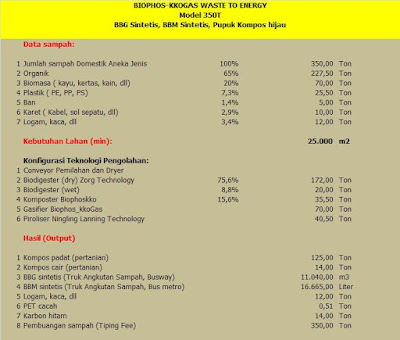 Berbagai alat teknologi dalam membentuk konfigurasi BiophoskkoGas tersebut dapat dipilih didasarkan pada tujuan konversi serta target volume yang direncanakan. Salah satu konfigurasi dengan ini dikenalkan pilihan teknologi dan estimasi biaya Sarana Pengolahan Sampah Biophos_kkogas WTE 350 T