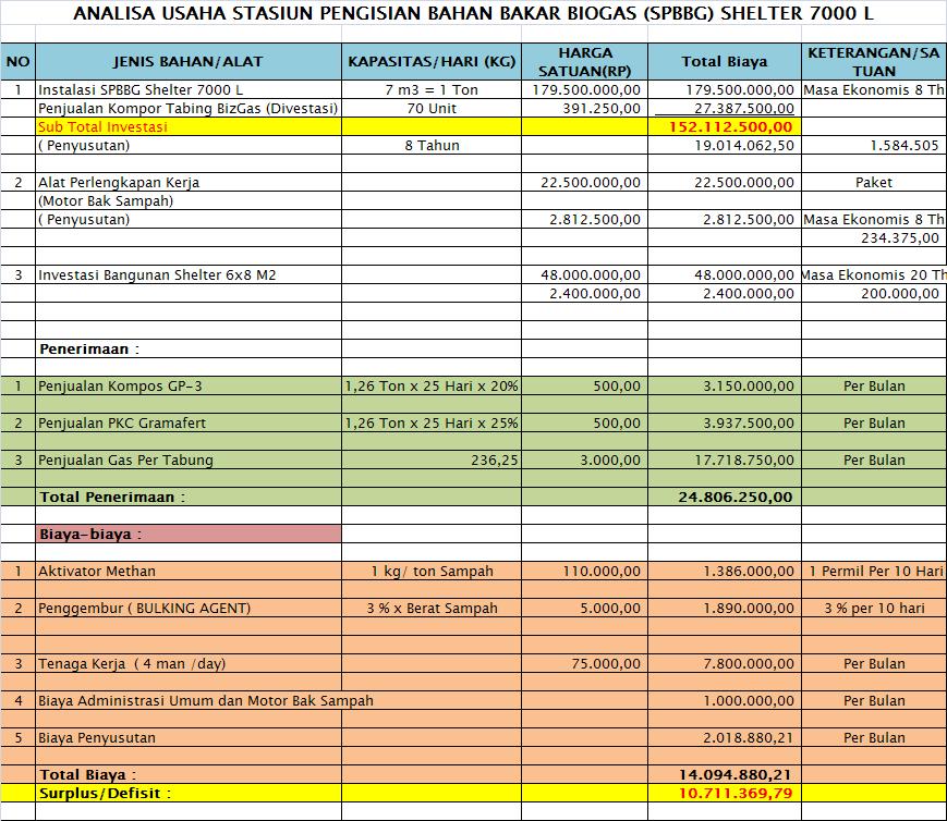 Pendapatan SPBBG shelter 7000 L ( pupuk organik dan biogas) Rp 24.086.250/ bulan, setelah dikurangi biaya operasional ( perawatan, gaji karyawan, aktivator dan bahan habis pakai) dan penyusutan alat mesin akan membuahkan laba Rp 10.711.369,- / bulan.