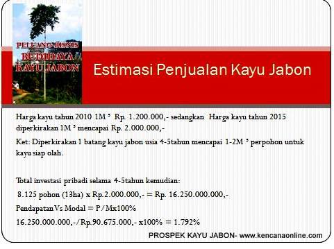 Pada kondisi bebas dari serangan penyakit, kedua jenis tanaman kayu ini sama-sama memberikan prospek pendapatan yang tinggi. Jika 1 pohon ( usia 5 th)= 1 m3, dan kini berharga Rp 1,2 jt, maka proyeksi pendapatan dari penjualan tanaman kayu/ Ha = 500 pohon/ Ha ( jarak tanam 5 x 4) x Rp 1,2 juta, setara 600 jt. Padahal, biaya/ Ha berupa bibit Rp 5000/ ph + biaya perawatan 1 th ke I sekitar Rp 1,3 jt, tidak terbayangkan jika invetasi ratusan Ha. Disamping keuntungan ekonomi, penanaman jabon, sengon/ albasia dan aneka kayu keras lainnya, dari setiap Ha nya sekaligus juga mampu menyumbang oksigen bagi kebutuhan 1000 manusia lain di bumi. Diketahui, 1 pohon memberi oksigen bagi 2 orang manusia. Mengusahakan tanaman kayu jabon dan albasia, suatu peluang agribisnis menarik, sekaligus ikut berperanan dalam mengurangi efek rumah kaca dan pemanasan global*)